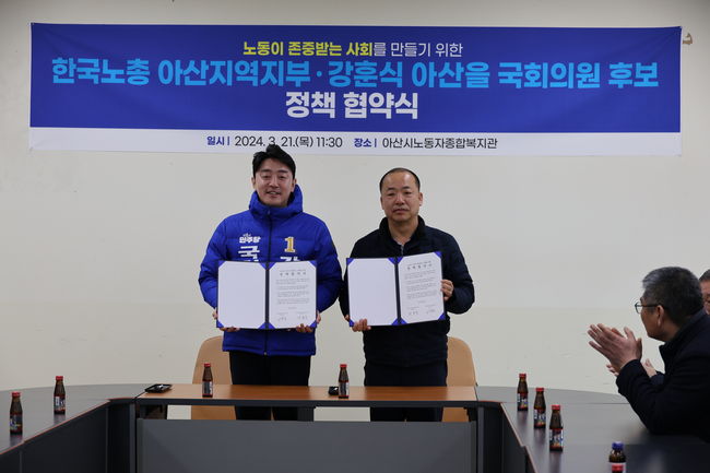 한국노총 아산지부와 제22대 국회의원 선거 강훈식 더불어민주당 아산을 후보는 아산시 노동자들의 노동의 가치가 존중받는 사회를 위해 주 4.5일제 도입 등 개혁 입법과제 발굴, 아산시노동자종합복지관 이전·설립 지원, 정례적 정책협의체 구성 등 광범위한 정책연대로 나아갈 것을 협약했다.