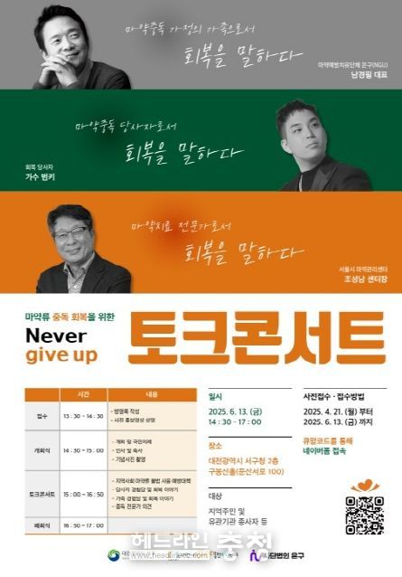 헤드라인충청 최병옥 기자 | 대전 서구는 오는 6월 13일 금요일 세계 마약 퇴치의 날을 기념한 토크콘서트 ‘Never give up’을 서구청 구봉산홀에서 개최한다.