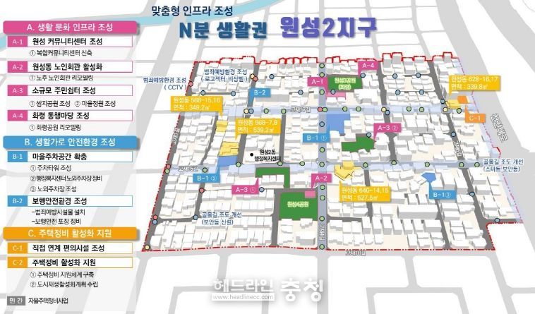 2025년부터 5년간 국도비 180억 원을 포함 총 250억 원을 투입해 원성2지구 15만㎡에 주차타워·노외주차장을 조성하고 건강증진센터·생활문화시설 등 주민 편의시설이 제공되며, 스마트 기능이 도입된 화령공원 리모델링, 골목길·도로정비사업 등이 추진된다.