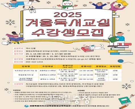헤드라인충청 권은숙 기자 | 세종특별자치시교육청평생교육학습관은 겨울방학을 맞이하여 초등학교 3학년부터 중학교 3학년까지 학생들을 대상으로 2025년 겨울독서교실 수강생을 모집한다.