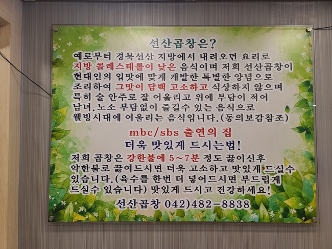곱창으로 유명한 구미 근처 선산 지역의 선산곱창이 원조인데 이맛을 볼수 있는 곳은 대전에서 이곳이 유일하다.