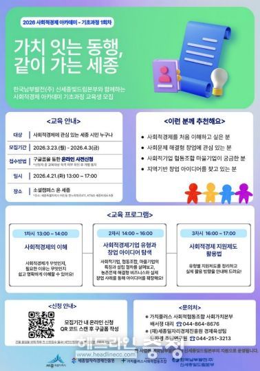 헤드라인충청 권은숙 기자 | 세종일자리경제진흥원이 한국남부발전㈜ 신세종빛드림본부와 협력해 지역 내 사회적경제 인재를 발굴하고 창업을 지원하기 위한 ‘2026 사회적경제 아카데미’를 운영한다.