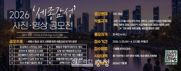 헤드라인충청 권은숙 기자 | 세종시문화관광재단(대표이사 박영국)은 세종시의 도시 일상 감성과 관광 매력을 담은 ‘2026 세종감성 사진영상 공모전’을 개최한다고 밝혔다.