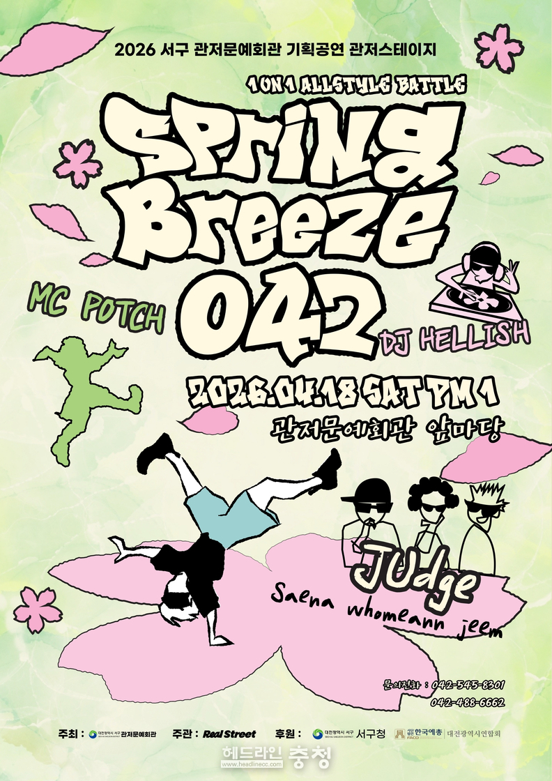 관저문예회관은 오는 4월 18일 오후 1시, 야외 앞마당에서 ‘관저스테이지 <Spring Breeze 042 Battle>’을 연다고 밝혔다. 이번 행사는 지역 청년과 청소년을 중심으로 한 스트릿 댄스 경연으로, 약 60여 명 이상의 참가자가 무대에 오를 예정이다.