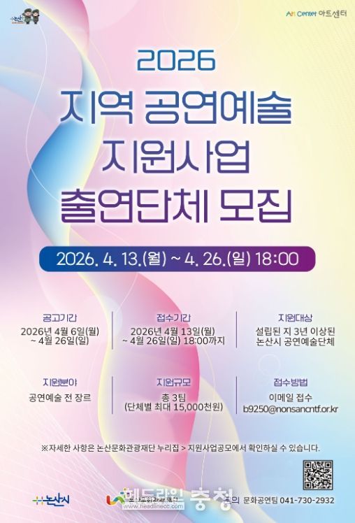 헤드라인충청 최주일 기자 | (재)논산문화관광재단은 오는 4월 13일부터 4월 26일까지 ‘지역 공연예술 지원사업’ 출연단체 모집 공모를 진행한다.