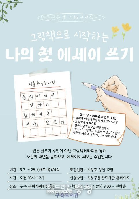 헤드라인충청 최병옥 기자 | 대전 유성구는 5월 7일부터 28일까지 구즉도서관에서 성인을 대상으로 ‘마음근육 벌크UP 프로젝트–그림책으로 시작하는 나의 첫 에세이 쓰기’ 프로그램을 운영한다.