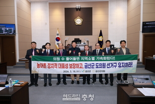 충남도의회가 지방선거를 앞두고 지연되고 있는 선거구 획정에 강한 우려를 표명하며, 농어촌 지역의 정치적 대표성 보장을 위한 관련 법 개정을 국회에 강력히 촉구했다. 도의회는 17일 충남도청 브리핑룸에서 기자회견을 열고 시·도의회 의원의 조속한 선거구 획정과 도의원 정수 배분 문제 개선을 요구했다. 홍성현 의장은 "예비후보자 등록 기간이 지났음에도 국회 정치개혁특별위원회가 선거의 기본 룰인 선거구 획정조차 정하지 못하고 있다"며 "이는 후보자와 유권자 모두에게 혼란을 초래하는 심각한 상황"이라고 비판했다. 이어 "매번 반복되는 획정 지연을 막기 위해 독립적·중립적인 기관이 획정하고 국회가 의결하는 방식도 진지하게 검토해야 한다"고 덧붙였다. 특히 도의회는 현재의 인구 중심 선거구 획정 방식이 농어촌 지역의 대표성을 심각하게 훼손하고 있다고 지적했다. 현행 공직선거법 제22조에 따르면 도의원 정수 기준은 인구 5만 명 미만 최소 1명, 그 이상 최소 2명으로 규정돼 있다. 이에 따라 인구 5만 명 선이 붕괴된 금산군과 서천군의 경우 광역의원 정수가 각각 2명에서 1명으로 축소될 위기에 놓였다. 홍 의장은 "면적 577.2㎢의 금산과 366.1㎢의 서천 전